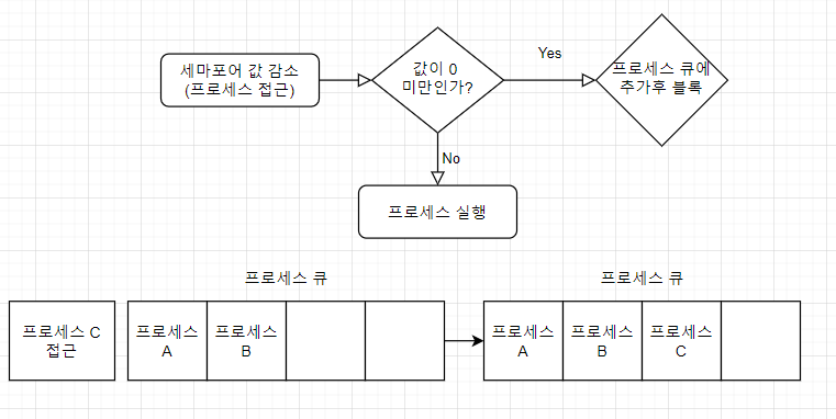 세마포어의 연산으로 인해 대기중인 프로세스는 선입선출의 구조를 가진 큐에 저장이 됩니다.