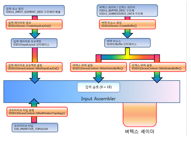 파이프라인의 이후 단계들이 사용할 정점 데이터를 긁어 모으는 단계입니다. 정점들의 연결성을 파악하고 바람직한 렌더링 구성을 결정합니다. 이 데이터들은 정점 셰이더 단계로 넘어갑니다. |
